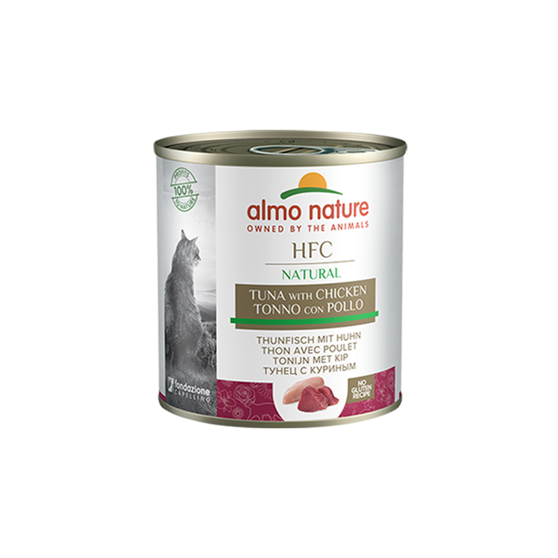 Almo Nature HFC recipes are made from ingredients originally suitable for human consumption, but used instead in our cat food. The origin of the ingredients can be easily traced and identified, guaranteeing that the recipes in this range provide a natural and high quality supply of animal protein. This maintains the nutrient balance at the highest level and stimulates mental well-being. HFC Natural recipes - our most famous product and original recipe - are simply cooked in the product's own broth, helping to maintain cats' natural hydration. The recipes are free from food colourings and chemical preservatives. Gluten-free.