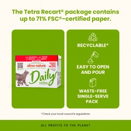 Daily recipes are prepared with ingredients suitable for pet food: complete foods, which cater for a large number of adult cats, thanks to the variety of their ingredients (meat and offal). Daily recipes guarantee a healthy, Almo Nature quality diet, at affordable prices! The entire range is free of artificial preservatives and colours. Both the tin...