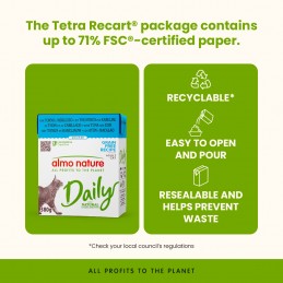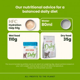 Daily receptes ir izgatavotas no sarkanās gaļas, baltās gaļas, zivīm, olām, dārzeņiem un rīsiem, kas piemēroti mājdzīvnieku barībai. Viss klāsts nesatur mākslīgas krāsvielas un konservantus. Ikdienas ēdienkartes receptes ļauj nodrošināt maltītes ar Almo Nature kvalitātes garantiju par vēl ērtāku cenu!