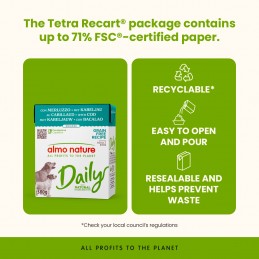 Daily receptes ir izgatavotas no sarkanās gaļas, baltās gaļas, zivīm, olām, dārzeņiem un rīsiem, kas piemēroti mājdzīvnieku barībai. Viss klāsts nesatur mākslīgas krāsvielas un konservantus. Ikdienas ēdienkartes receptes ļauj nodrošināt maltītes ar Almo Nature kvalitātes garantiju par vēl ērtāku cenu!